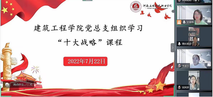 2022年07月22日下午,beat365英国官网网站党总支组织全体教师学习“十大战略”系列课程之《实施优势再造战略 重塑河南高质量发展新优势》,本次学习通过腾讯会议形式进行线上学习,旨在贯彻落实省委“能力作风建设年”活动要求,引导全体教师关注省委部署的关键性、战略性、全局性工作,为现代化河南建设贡献教育力量,会议由学院党总支书记马春燕主持。