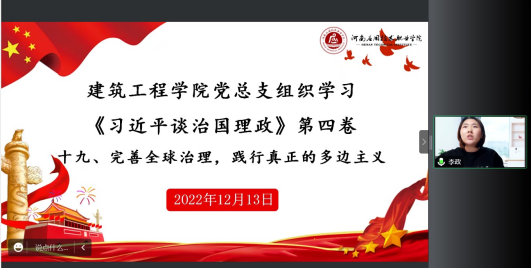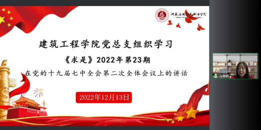 2022年12月13日下午,beat365英国官网网站党总支通过腾讯会议组织开展线上政治理论学习活动,集中学习了《求是》2022年第23期习近平总书记重要文章《在党的十九届七中全会第二次全体会议上的讲话》《习近平谈治国理政》第四卷、《全面从严治党向基层延伸》《习近平生态文明思想学习纲要》《习近平经济思想学习纲要》等部分内容。会议由beat365英国官网网站党总支书记马春燕主持,院长张虎及全体教职工参加会议。