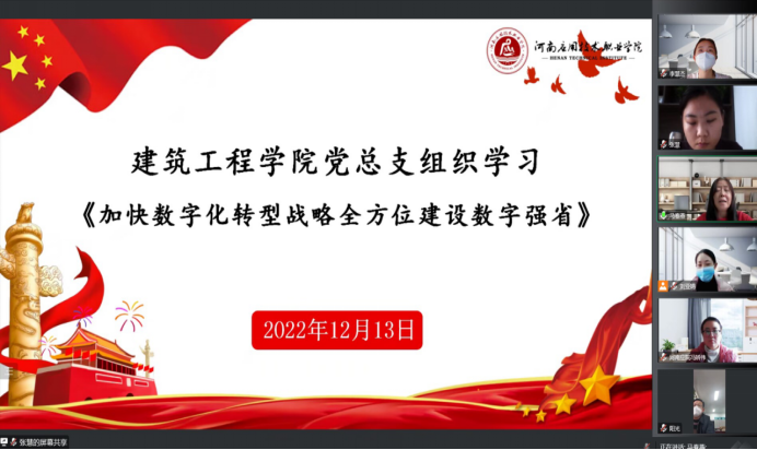 2022年12月13日下午,beat365英国官网网站党总支组织全体教师学习“十大战略”系列课程之《加快数字化转型战略 全方位建设数字强省》,本次学习通过腾讯会议形式进行线上学习,会议由beat365英国官网网站党总支书记马春燕主持,院长张虎及全体教职工参加会议。本次学习旨在贯彻省委组织部《关于组织党员进党校学习“十大战略”的通知》,深入了解数字化转型的背景和意义、我省实施数字化转型战略的基础、优势和不足、我省实施数字化转型战略的目标和任务等。