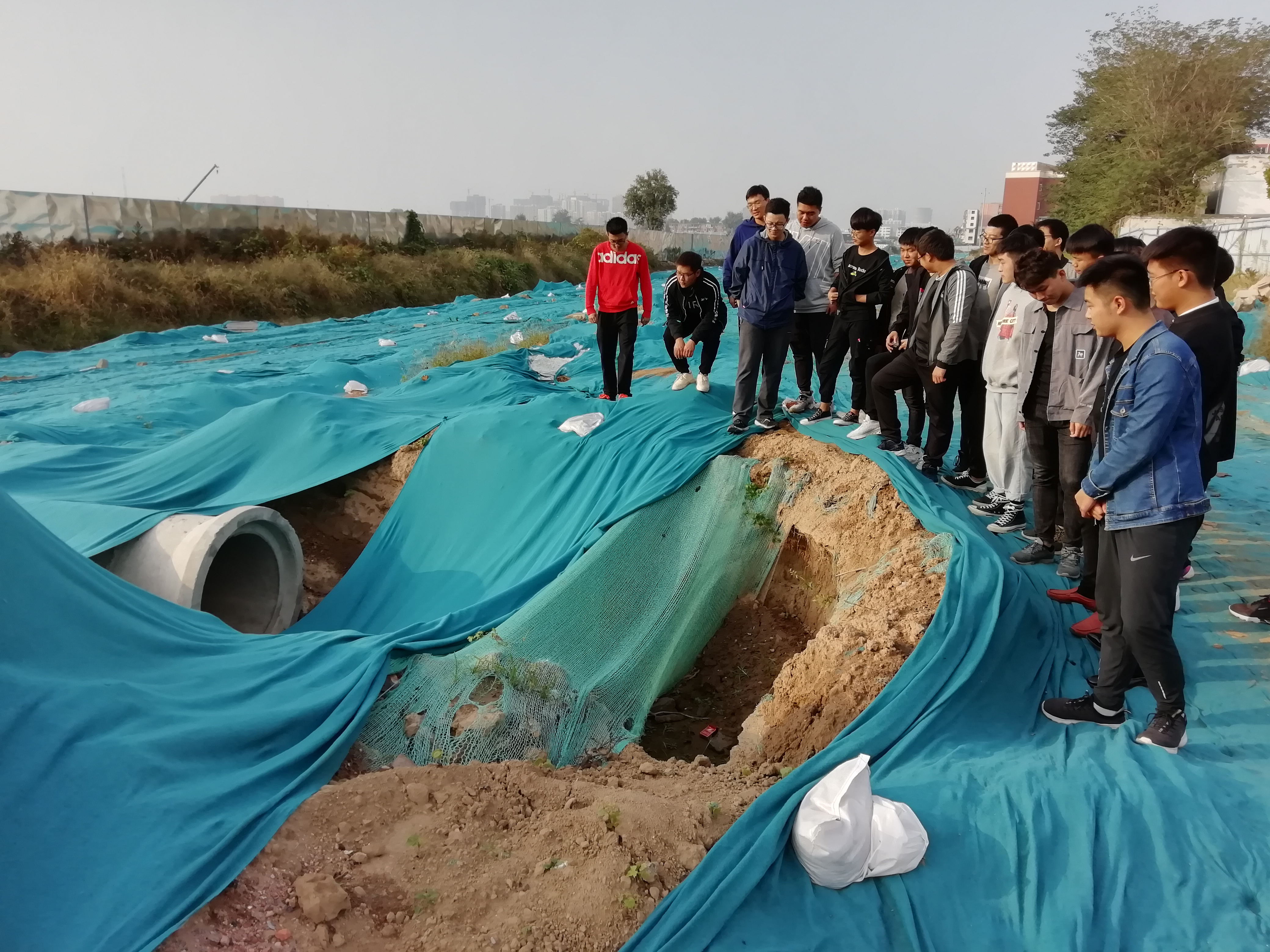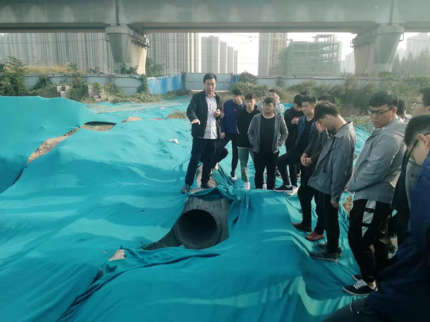 学校西边工地是一个在建市政道路项目,双向两车道,计划明年8月底完工。在工地现场,刘老师向同学们介绍了城市道路的分类和施工工序流程,道路冬季施工中安全、环保的一些注意事项,以及道路施工项目管理中的知识。