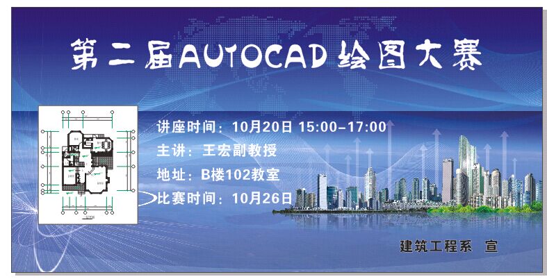 2015年10月20号下午,我系王宏教授为全校师生作了一场集知识性与趣味性于一体的精彩讲座。王教授依托自己多年从事CAD教学研究的积淀,深入浅出的对建筑CAD制图软件的广泛应用空间、学习建筑CAD制图课程的意义、学生就业后的作用、以及如何学好建筑CAD软件、建筑CAD绘图技巧以及“建筑工程系第二届建筑CAD制图竞赛”的注意事项等内容作了具体的阐释。为同学们展示了各类CAD作品,同学们在听讲座的过程中感受到了建筑CAD的魅力所在。王教授用娴熟的操作,渊博的知识打动了在场的每一位听众,讲座结束时获得了经久不息的掌声。