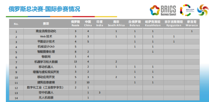 该项赛事由俄罗斯技能发展署(俄罗斯世界技能)、俄罗斯战略倡议署、金砖国家工商理事会、鞑靼斯坦共和国政府、俄罗斯科学和高等教育部、“一带一路”暨金砖国家技能发展国际联盟、教育部中外人文交流中心主办,是重要的国际赛事之一。汇聚了来自8个国家,114个参赛代表队,围绕14个赛项展开了为期三天的激烈竞技。