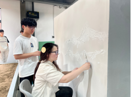 此外,项目创新性地融入艺术设计环节,《山水映窗》巧妙运用抹灰层次变化,在墙面营造出传统花窗与绘图意境。在墙面营造出传统花窗与日照金山的意境。“手绘墙面过程中,要同时保证抹灰墙面的整洁性,要能及时应对突发情况,重新调整抹灰面。”团队成员谭舒文说道。学院建筑工程技术教研室主任冯娇伟强调:"职业教育不仅要培养技能,更要激发创造力。这个项目也是我们推行'岗课赛证'融通改革的案例,很大程度上激发学生创新动手能力。”