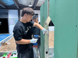 本次项目参照行业标准,要求选手在8小时内完成基层处理、砂浆抹灰、肌理塑造等全流程操作。项目现场,熊富豪、王浩然、谭舒文、卢雨晨、李超强几位学生在"弹线定位""灰板托浆"等基础工序阶段反复修整,保证施工精度,石膏板切割过程,识图与算量是关键。"尺寸误差不能超过1毫米,我们组返工了三次才达标。"熊富豪说道。指导老师韩晓芳介绍:“从最开始的集体讨论,到亲手挑选每一块轻钢龙骨、每一袋石膏粉,到最终完成项目,学生坚持每天训练,这种精益求精的态度正是职业教育的精髓。”