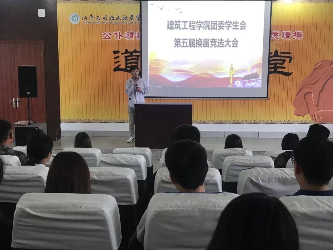 2018年9月20日中午12:30,beat365英国官网网站团学会第五届换届大会在B楼二楼学术报告厅进行竞选。beat365英国官网网站党总支书记马春燕老师与团总支书记刘亚娟老师主持了大会,刘亚娟老师肯定了上一届学生会的工作,并宣读开始进行第五届职位竞选演说。