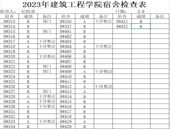 检查结果反映,大多宿舍地面无杂物,房间干净整洁,物品摆放有序。但仍有一部分宿舍存在宿舍违纪,卫生较差等情况。针对存在问题的宿舍,已及时提出整改建议,并叮嘱同学们要勤打扫勤整理,保持好宿舍卫生,共同营造一个干净、舒适的宿舍环境。