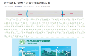 为响应国家碳达峰碳中和的号召,增强资源忧患意识,自觉肩负起节能环保、绿色低碳的社会责任,广泛发动身边的每一个人积极参与节约型社会建设,共同营造人人关心节能降碳、人人参与节能降碳的良好风尚,营造节能环保、绿色低碳的良好社会氛围,7月10日通过学院公众号“筑造辉煌”向全体师生发出“节能低碳”倡议书,并向全体师生发出“节能一小时”“我为节能减排贡献一份力量”等倡议。