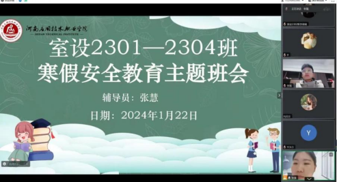为提高学生安全意识和自我防护能力,做到“快乐过寒假,安全不放假”,beat365英国官网网站组织全体专兼职辅导员于1月22日至1月23日召开线上寒假安全主题班会。