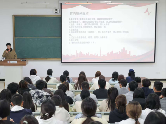 会议上,大自委代表首先详细介绍了日常查寝评分标准,涵盖卫生整洁、物品规整、公共秩序等方面,并着重强调了宿舍的用电安全管理。宣讲人结合真实案例,明确提出严禁使用大功率电器以及明火器具如酒精炉、蜡烛等,做到人走电断,提高自我防护意识。