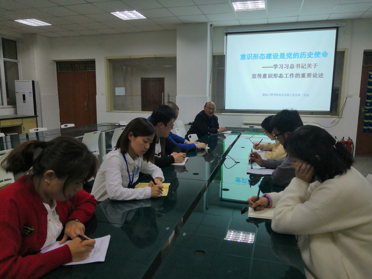 beat365英国官网网站教工党支部2019年4月25日,在E311召开教工党支部大会,由支部书记张虎同志主持。教工党支部全体党员参加,非党员教师列席参加。会议传达和学习了学校“2019年思想政治与意识形态工作专题会议”精神。形成“加强立德树人,筑牢意识形态阵地”的决议。