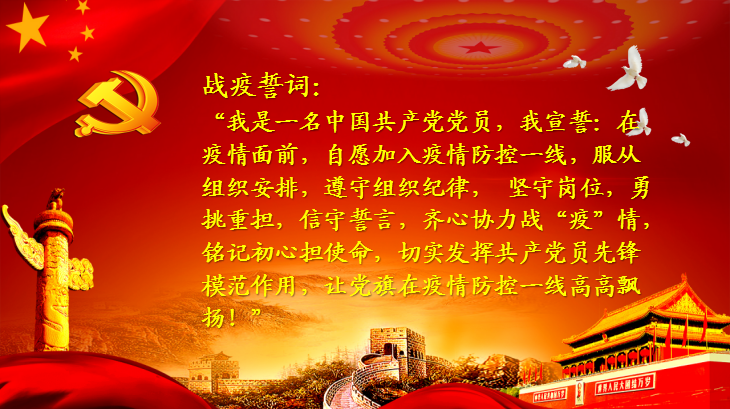 第二,马书记带领大家认真宣读了战疫誓词:“我是一名中国共产党党员,我宣誓:在疫情面前,自愿加入疫情防控一线,服从组织安排,遵守组织纪律, 坚守岗位,勇挑重担,信守誓言,齐心协力战“疫”情,铭记初心担使命,切实发挥共产党员先锋模范作用,让党旗在疫情防控一线高高飘扬!”通过战疫誓词的宣读,大家纷纷表示“一个党员就是一面旗帜,一个支部就是一座堡垒”,越是到关键时期,我们党员必须首先站出来、敢于冲上去。