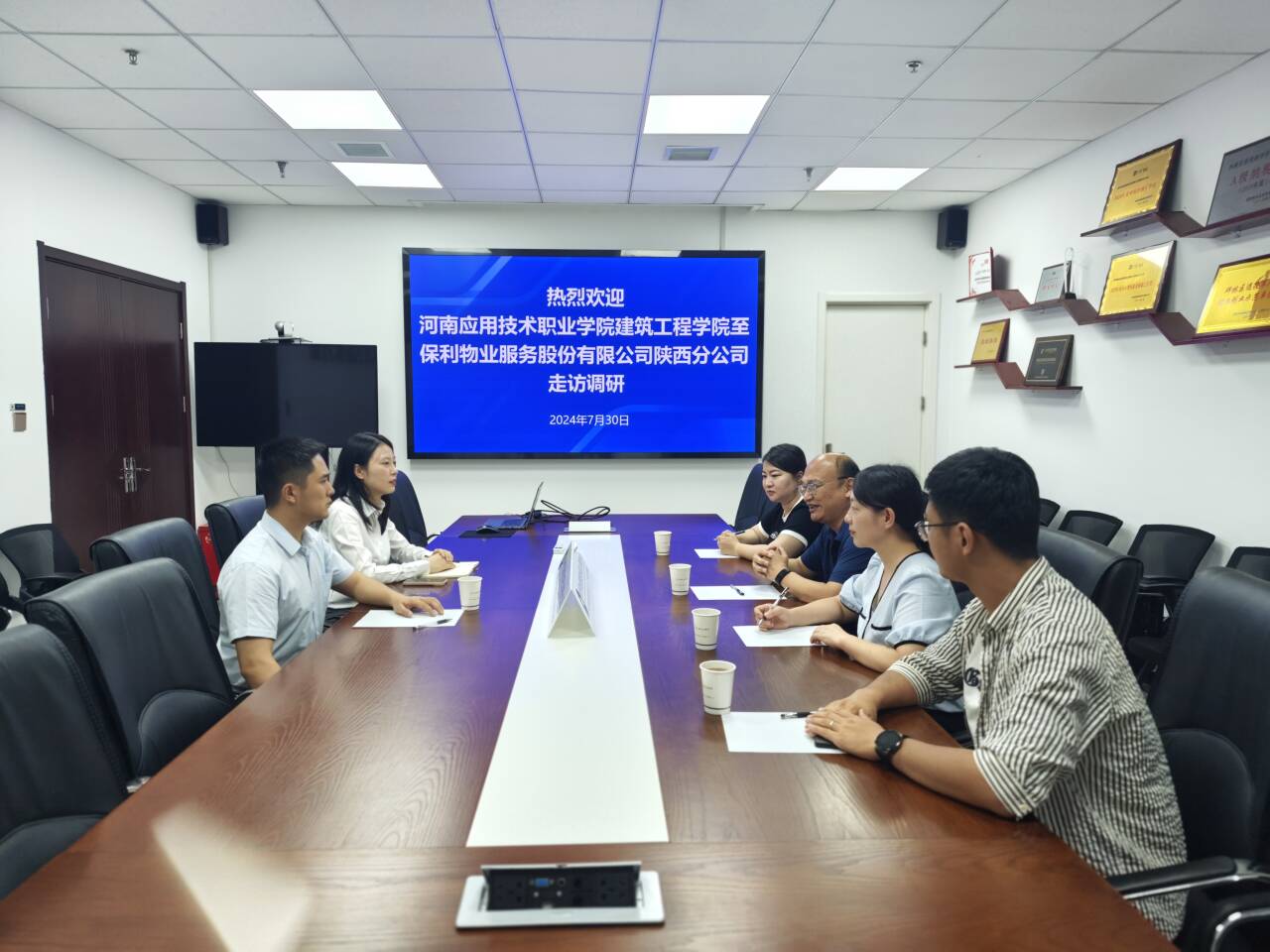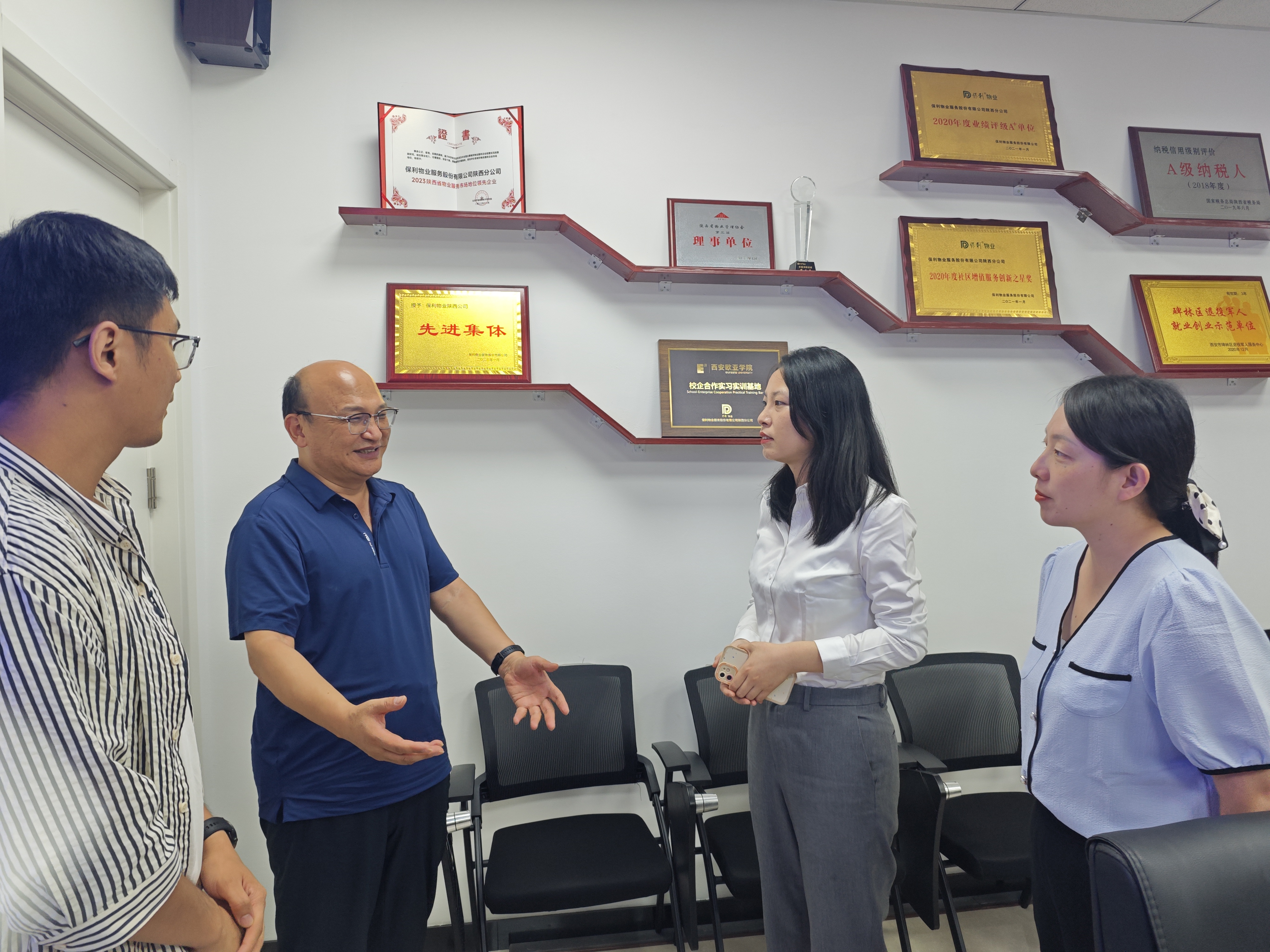为进一步贯彻落实高校毕业生就业工作决策部署,开拓更多就业岗位,服务学生高质量就业,打通用人单位和毕业生之间的信息壁垒,全力拓宽学生就业渠道,2024年7月30日,beat365英国官网网站党总支书记张虎、党总支副书记刘亚娟、团总支书记王莹及专职辅导员罗斐、宋雅雯一行至保利物业服务有限公司陕西分公司开展走访调研。