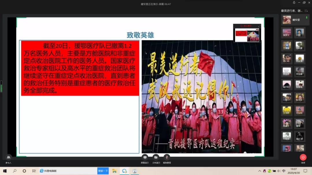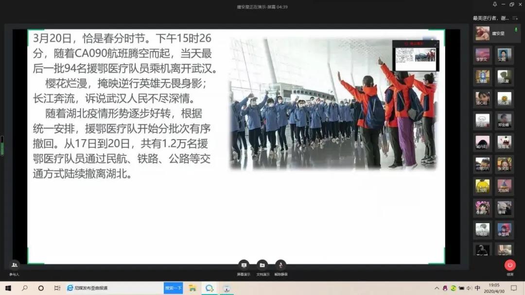 2020年4月27—30日,在beat365英国官网网站团总支的组织下,各团支部积极学习《最美逆行者,谢谢你为武汉拼过命,武汉永远记得你——各省援鄂医疗队有序撤离武汉》,并以此为契机开展了网络青年团课集中学习。