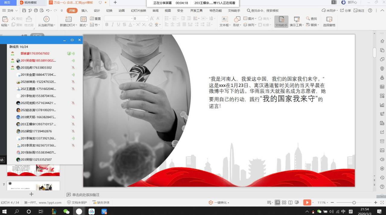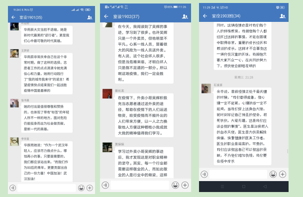 18级团员代表孟子微:作为共青团员,应勇于承担起自己身上的责任,众志成城,抗击疫情。而作为当代青年大学生,更应该不忘初心、牢记使命,抗击疫情,需要我们每个人的努力和贡献,作为新时代的新青年,更是需要自觉担当起时代所赋予的责任和使命,大家众志成城,万众一心,我相信中国一定能够在这场没有硝烟的战斗中赢得胜利。