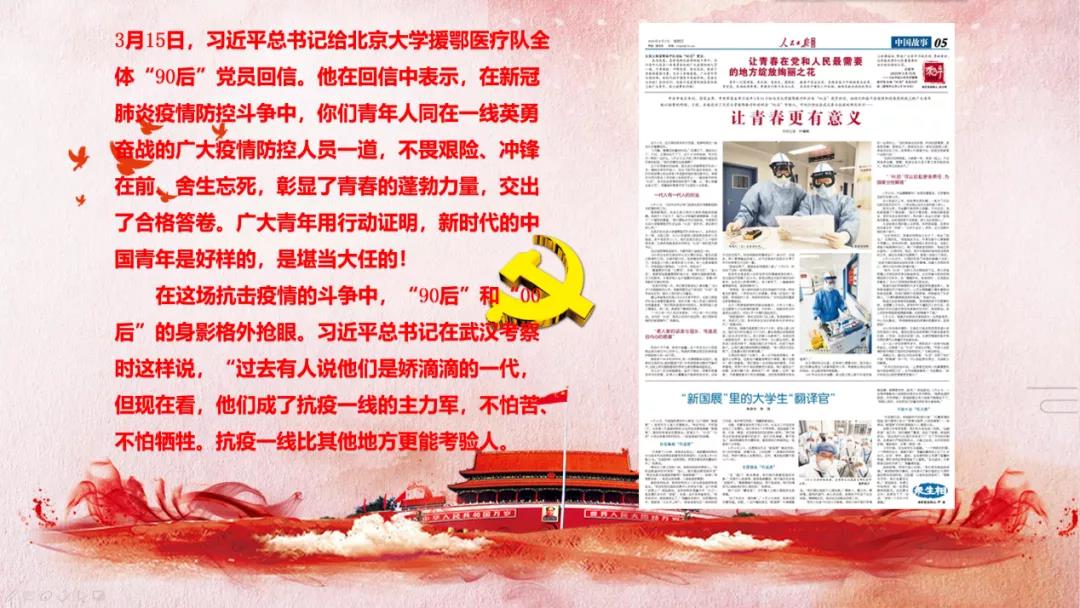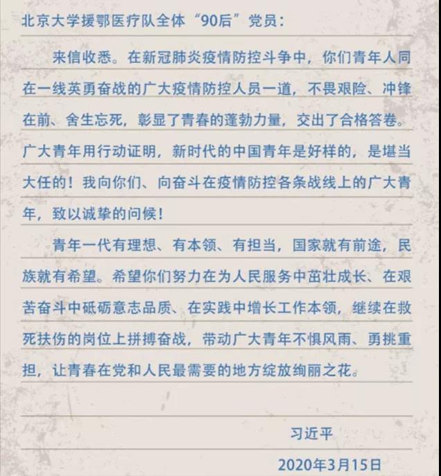 中共中央总书记、国家主席、中央军委主席习近平3月15日给北京大学援鄂医疗队全体“90后”党员回信,向他们和奋斗在疫情防控各条战线上的广大青年致以诚挚的问候。回信中,字里行间充满着对青年的深切期望、殷殷嘱托。在这次抗击疫情的斗争中,以“90后”为代表的青年一代挺身而出、担当奉献,充分展现了新时代中国青年的精神风貌。这不仅仅是写给北大援鄂医疗队的年轻英雄们,更是对我辈青年大学生、党员、团员的鼓励和期许。我们是新时代的弄潮儿,既脚踏实地,又敢闯敢拼,在这场没有硝烟的战役中,我们接受党和国家对我们的考验,学习前辈“干惊天动地事,做隐姓埋名人”奉献精神,用青春之我、青春之力、青春之声,掀起红色生命的浪潮。