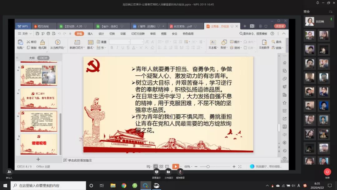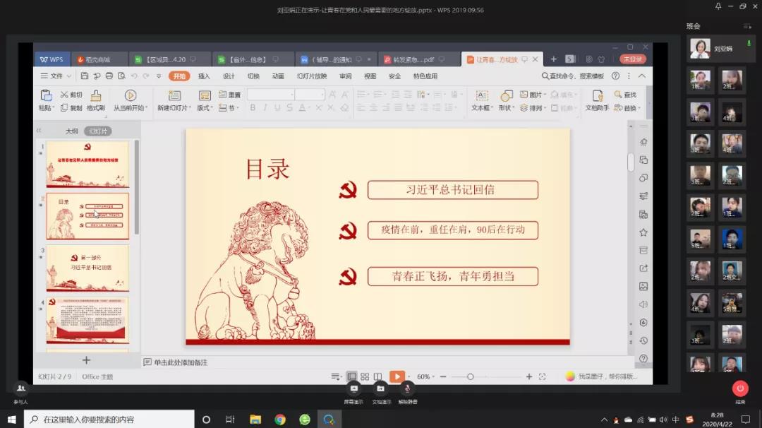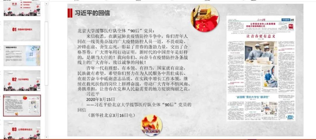 2020年4月20—24日,在beat365英国官网网站团总支的组织下,各团支部积极学习“习近平回信勉励北京大学援鄂医疗队全体‘90后’党员——让青春在党和人民最需要的地方绽放”并以此为契机开展了网络青年团课集中学习。