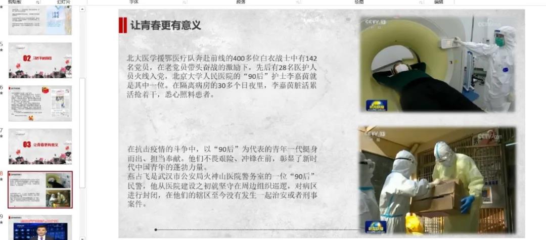 各团支部利用线上网络视频会议,线上集体讨论等学习方式,引导广大青年深入学习以援鄂青年为榜样,同时应做到“四学三做”:要学习抗疫一线人员的爱党爱国精神、无私奉献精神、团结协作精神和勇于担当精神,要做一个爱国有志、有理想有思想、有责任有担当的青年。认真学习习近平总书记给北京大学援鄂医疗队全体‘90后’党员回信,进一步明确当代大学生身上所肩负的重担,并鼓励大家时刻以一名优秀团员的标准来要求自己。