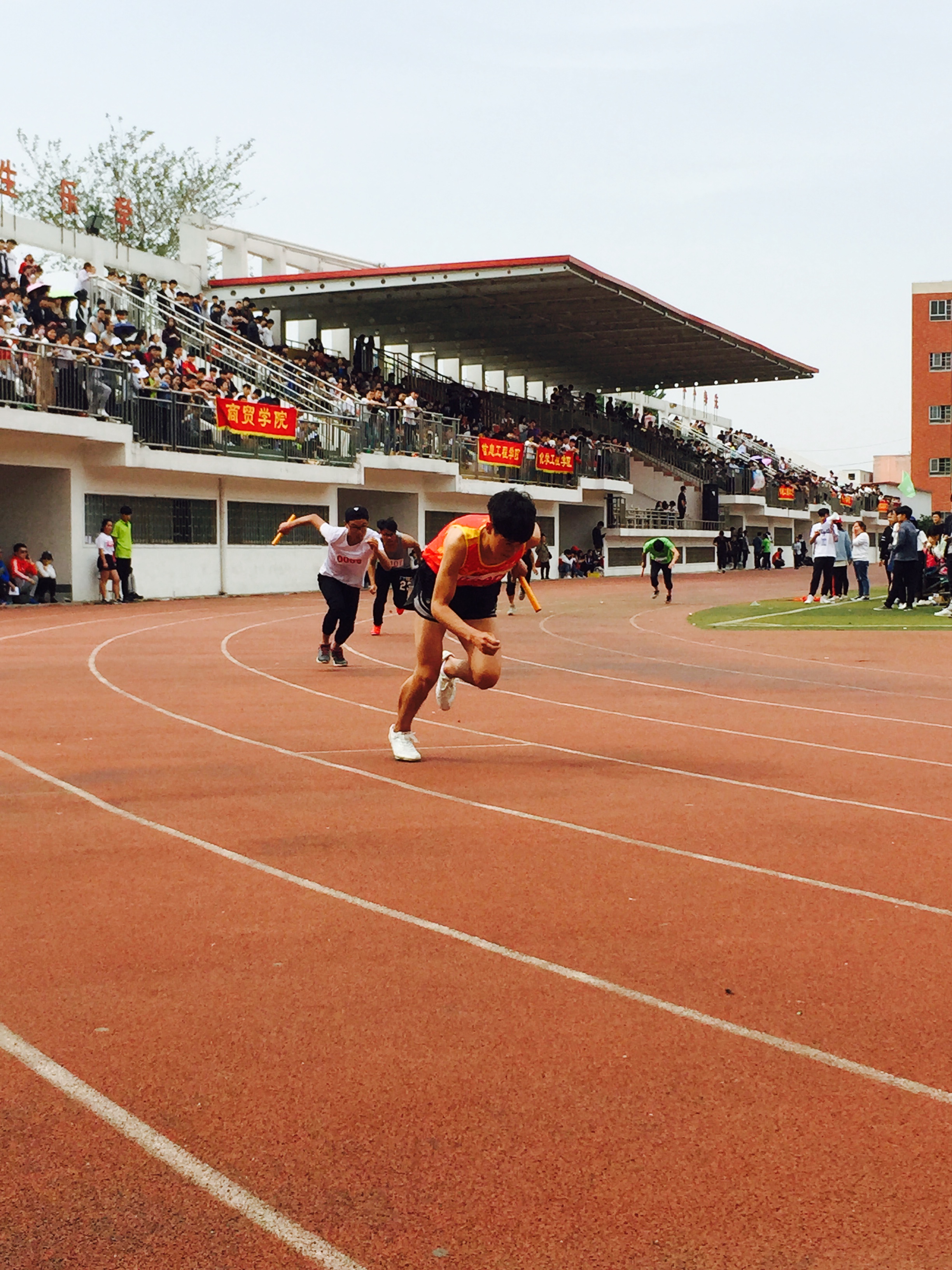 4*100的完美接力,他全速前进,由于体力透支,差点被超越,他没有轻言放弃,因为他是多少人的希望啊!咬紧牙关,冲向终点,当闯过胜利的红线时,翩若蝴蝶般跌倒在同学们的怀抱中。