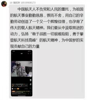 造价2102班秦田:“我羡慕宇航员,因为他们能亲眼见到太空的魅力。我也崇拜他们,因为他们历经层层困难,勇敢面对未知的危险,愿意为太空事业随时贡献自己的生命。我知道,选拔宇航员要求十分苛刻,他们在背后付出了许多辛勤的汗水,无悔地坚持奋斗,我要向他们学习!虽然,我可能当不上太空人。作为青年,我们的目标就是努力学习争取为国争光。我们承载着祖国对我们的期望,我们一定会奋发图强,越飞越高。希望经过前人和我们这一代人的努力,常人登上太空不再是遥不可及的梦想。”