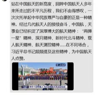 室设2105班姚育博:“航天精神的核心是爱国主义,航天人克服了重重困难,他们秉持“国家利益高于一切”的坚定信念,用无怨无悔的忠诚谱写赞歌,用攻坚克难的决心一往无前,用严谨求实的作风开创佳绩,让中国在探索宇宙奥秘和平利用太空事业中占有一席之地。传承航天精神是对中国航天人最好的致敬。青年一代当以航天精神为坐标,不管从事什么职业,航天精神都将指引着我们向上向善,在新时代长征路上奋勇拼搏、勇攀高峰,为实现中华民族伟大复兴的中国梦贡献自己的力量。”