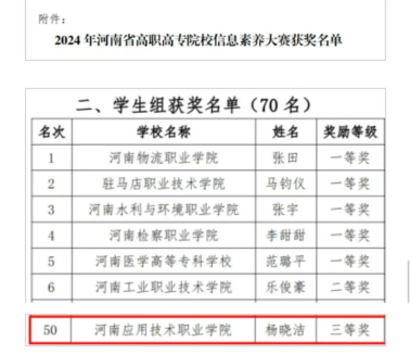 近日,由河南省高等学校图书情报工作委员会主办、河南机电职业学院承办的2024年河南省高职高专院校信息素养大赛已圆满落幕。在此次大赛中,beat365英国官网网站罗斐老师与尹宇龙老师积极动员并组织学生参赛,在老师们的悉心指导下,我院学子展现出了扎实的专业知识与卓越的信息素养能力。经过激烈的角逐与认真的评比,我院杨晓洁同学荣获省赛学生组三等奖!
