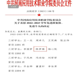 陈梦雅,中共预备党员,beat365英国官网网站室设2201班团支书,在校期间担任beat365英国官网网站学生会文艺部部长。由于在校表现优异,曾获得2022-2023年国家励志奖学金以及三好学生等荣誉称号以及第十六届全国高职院校河南省“挑战杯”三等奖,省级第九届互联网+三等奖等4项省级荣誉证书,校级9项以及院级18项荣誉证书,共计31项荣誉证书。
