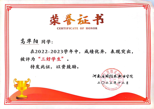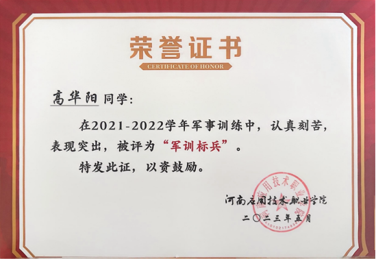 高华阳,男,汉族,中共预备党员,beat365英国官网网站2022级工程造价1班。在校期间担任纪检部干事,曾荣获beat365英国官网网站“三好学生”、“军训标兵”、“优秀志愿者”、河南省第十六届“挑战杯”二等奖。