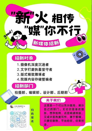 想锻炼自己的能力,结识更多志同道合的朋友吗?宣传部现正火热招新,期待你的加入!无论你是文案高手、沟通达人,还是创意满满的策划师,宣传部都欢迎你的到来!在这里,你将得到成长与锻炼,收获宝贵的经验和真挚的友谊。
