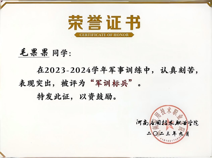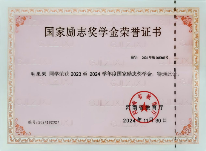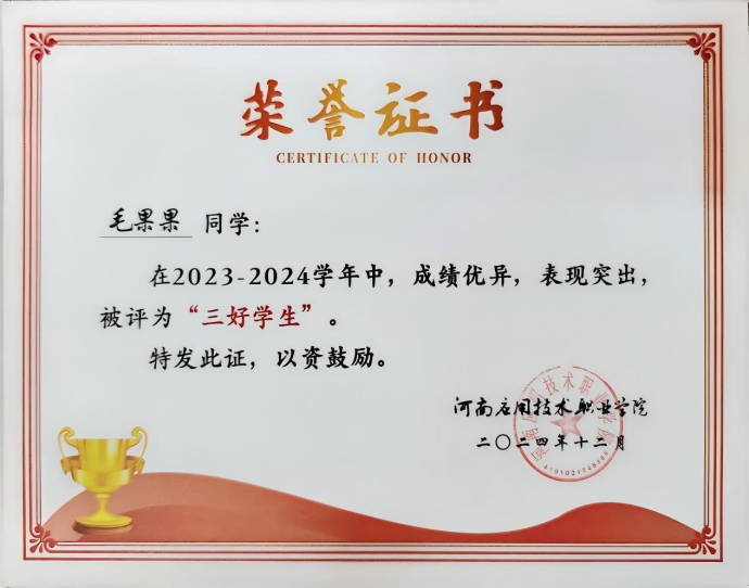毛果果,女,汉族,中共预备党员,beat365英国官网网站建筑工程技术2301班学生,辅导员罗斐。全年综合量化与专业成绩均稳居班级第一。在校期间曾获国家励志奖学金、省级三好学生、优秀共青团员、优秀学生干部,2024年中国国际大学生创新创业大赛河南省选拔赛三等奖、2025年该赛事河南省选拔赛二等奖,持有国家版权局计算机软件著作权登记证书。