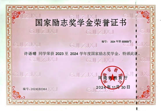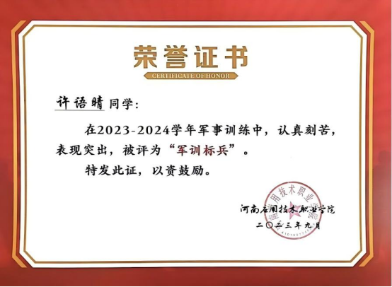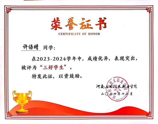 许语晴,女,汉族,河南郑州人,中共预备党员,beat365英国官网网站建筑室内设计2304班学生,辅导员尹宇龙。连续两学年综合成绩班级第一,在校期间积极参与社会实践活动与校园文化活动,曾获得国家励志奖学金、全国高职院校“发明杯”大学生专利创新大赛、河南省创新创业大赛二、三等奖、三好学生等多项荣誉。