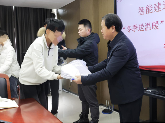常新中、宁晓冬、李勇、张蓄金共同为16名受助学生逐一发放暖冬大礼包。
