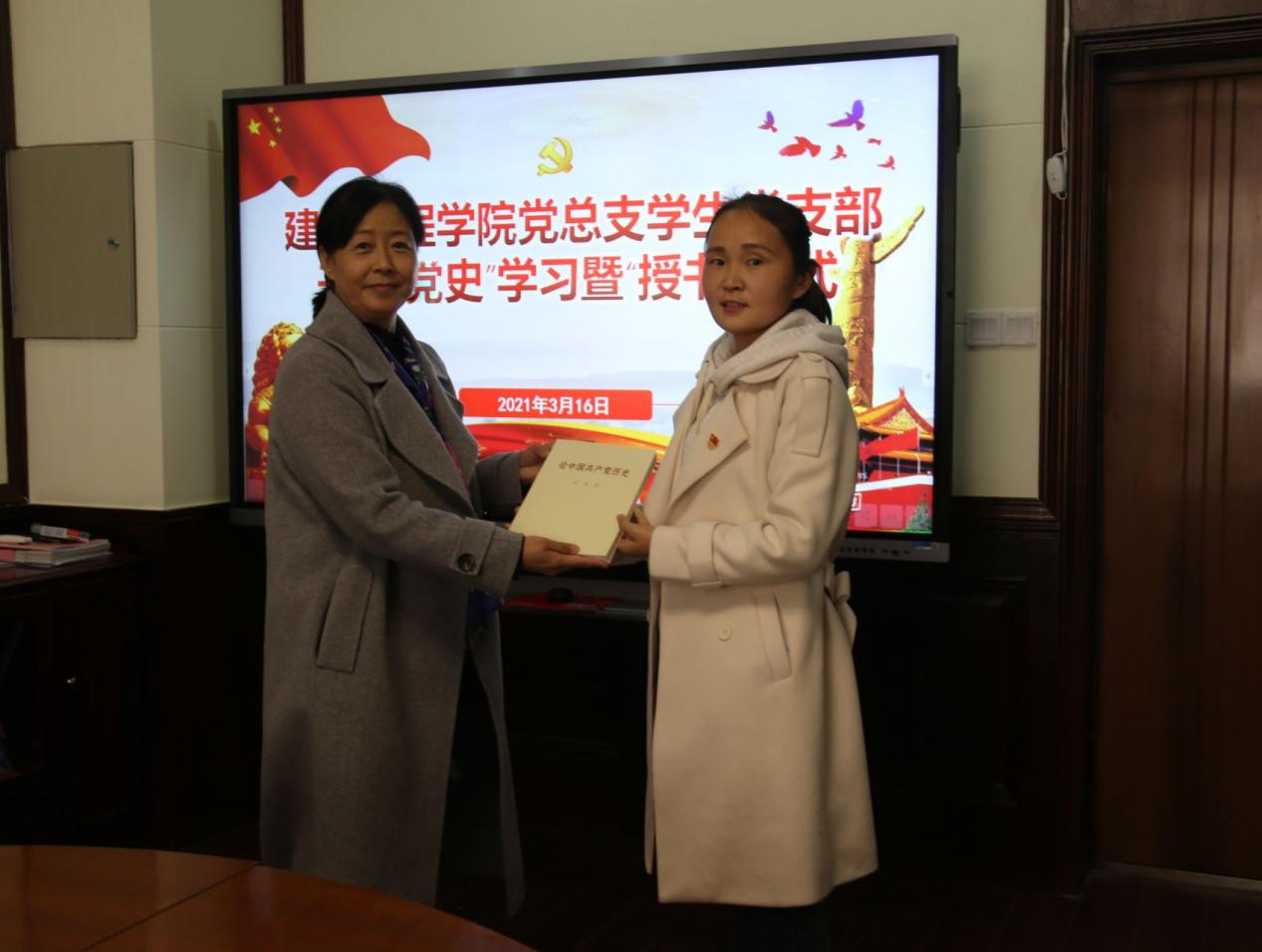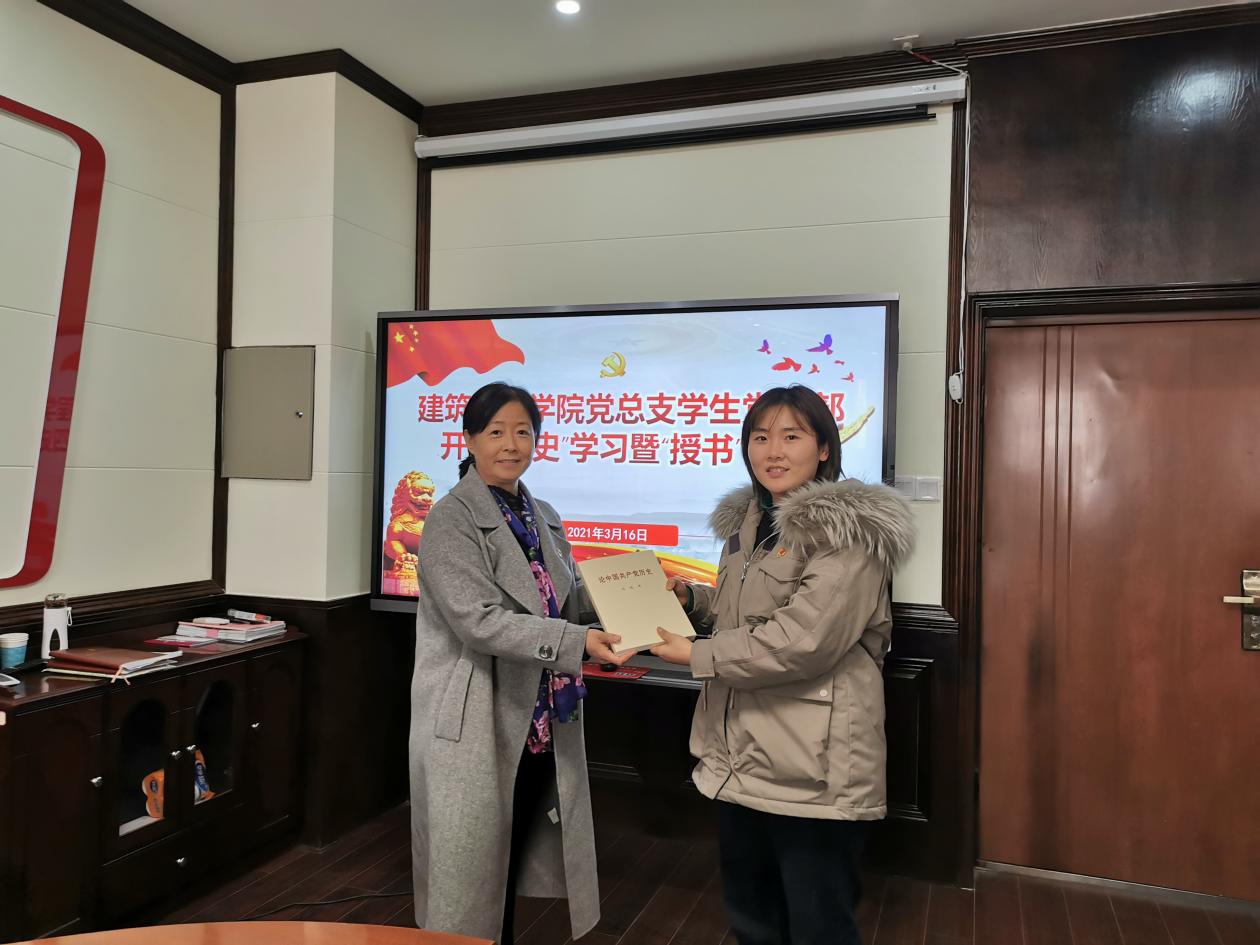 接下来,为让全体党员深入学好党史,回顾我们党团结带领中国人民不懈奋斗的光辉历程,学习党在各个历史时期创造的理论成果及为中华民族作出的伟大贡献。学生党支部举行了“授书”仪式,支部书记马春燕同志为每位党员发放书籍《论中国共产党历史》,并向党员同志强调要时刻牢记党员身上担负的责任和使命,通过各种方式全面系统学习、深入思考学习、联系实际学习,切实增强“四个意识”、坚定“四个自信”、做到“两个维护”。