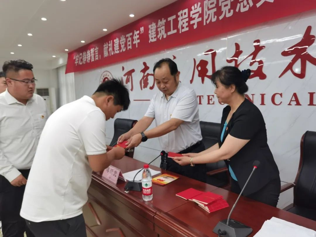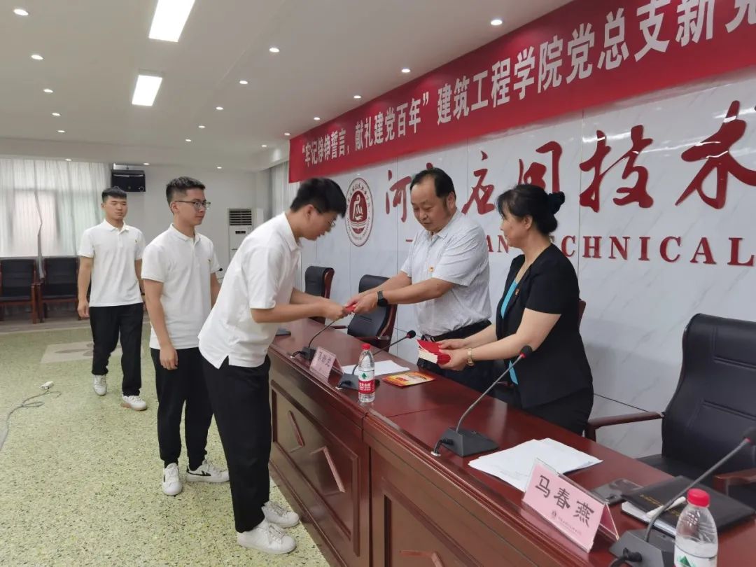 会议进行第二项,学校党委委员薄新党带领老党员们为新党员佩戴党员徽章,并为新党员发放《中国共产党章程》。