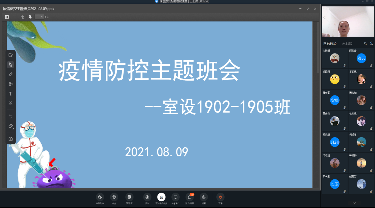 当下国内多地疫情防控形势严峻复杂,为增强我院学生疫情防控意识,贯彻落实学校对疫情防控的要求,进一步做好疫情期间学生的管理工作.在beat365英国官网网站党总支书记马春燕的安排部署下,各班辅导员、班主任组织召开了线上疫情防控安全教育主题班会。
