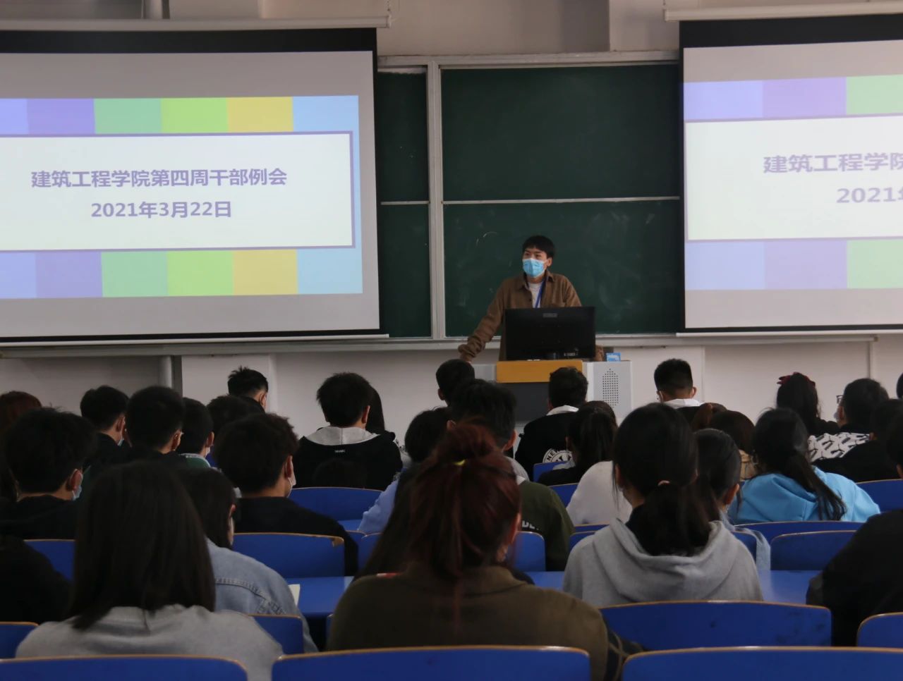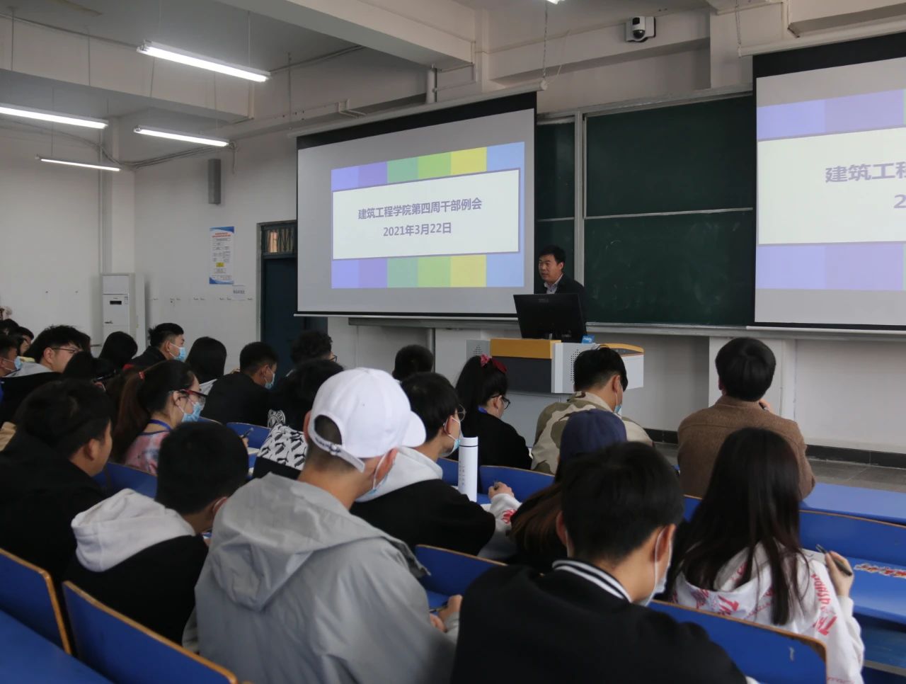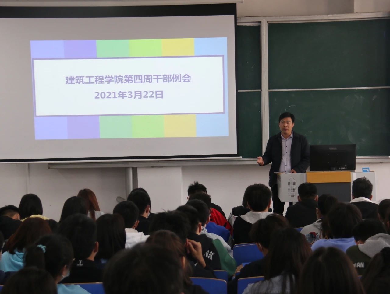 为提高小筑们的积极性,提升工作和学习的效率,beat365英国官网网站于2021年3月22日中午12:30,在B楼102教室召开了beat365英国官网网站第四周学生干部例会,(东校区以视频会议方式参加),参与本次会议的有刘高喜老师、李慧杰老师、孙雪理老师、团学会全体成员、入党积极分子及各班班长、团支书。会议开始,刘高喜老师强调,春季是流行病高发季节,大家要多参加校园活动,多锻炼,提高自身素质,宿舍要保持内务整洁,及时通风,预防传染性疾病发生。