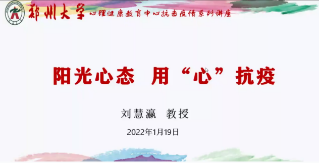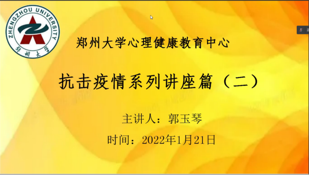 为切实做好疫情期间大学生的心理健康教育工作,进一步缓解学生心理压力,减轻心理负担,确保学生疫情期间的思想健康稳定。2022年1月19日、21日,beat365英国官网网站组织2019级、2020级、2021级三个年级辅导员、班主任参加郑州大学心理健康教育中心举办的抗击疫情系列讲座,讲座由郑州大学心理健康教育中心副主任刘慧瀛和郑州大学心理健康教育中心督导郭玉琴讲解。