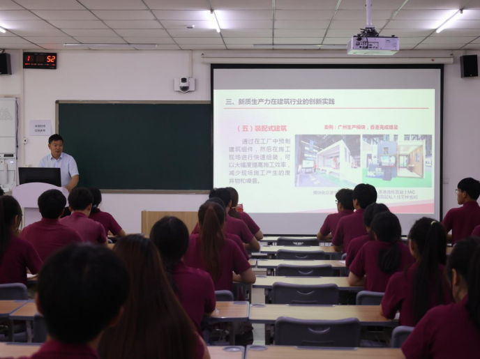 刘振民以两会报告中提出的“新质生产力”为切入点,详细解读了这一概念。围绕“深刻认识新质生产力的丰富内涵和特征;发展新质生产力,职业教育如何赋能;新质生产力在建筑行业的创新实践;发展新质生产力,应院建工学子当何为”等四个方面,通过丰富的案例和生动的语言,深入浅出地阐述了新质生产力的具体表现形式。他勉励全体青年学生要对党忠诚,以“矢志不渝”的坚定理想争做“心有所信”的青年排头兵;充电蓄能,以“全面过硬”的素质本领争做“腹中有墨”的青年排头兵;勇毅前行,以“驰而不息”的奋进状态争做“脚下有路”的青年排头兵。