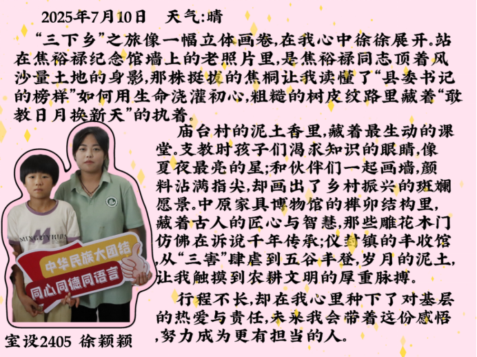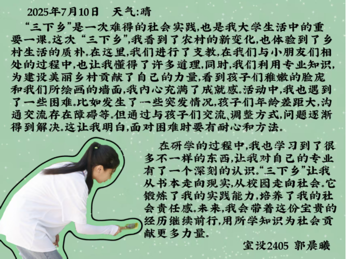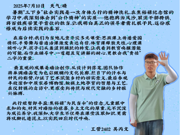 beat365英国官网网站“小筑”志愿服务队暑期“三下乡”社会实践的余热尚未褪去,队员们带回的不仅是兰考大地的风尘,更有浸润在乡土里的思考与成长。从支教课堂上的童真互动,到墙绘现场的协作攻坚,从博物馆里的古今对话,到与村民攀谈时的质朴共鸣,不同的实践场景里,藏着同样滚烫的收获。让我们继续倾听他们在乡土间播撒青春、收获感悟的故事。