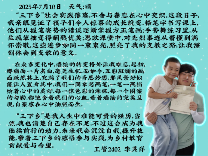 这些来自实践一线的心声,是青春与乡土碰撞出的火花,是理论与实践交融后的顿悟。无论是对专业价值的再认识,还是对责任担当的深刻体会,都让“三下乡”的意义超越了旅程本身。当这份经历化作前行的底气,当乡土的温度融入成长的轨迹,建工学子们终将带着这份赤子之心,在“见证美好中国”的路上,把每一份感悟都变成脚踏实地的力量,让青春在服务社会的实践中绽放更持久的光芒。